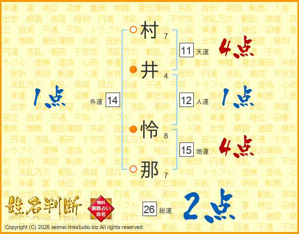 村(7画)井(4画) 怜(8画)那(7画)