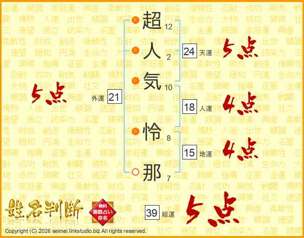超人気怜那さんの総運は39画の5点!