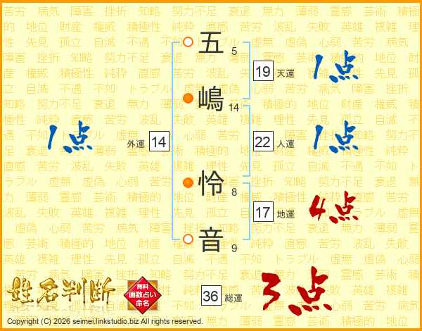 五(5画)嶋(14画) 怜(8画)音(9画)