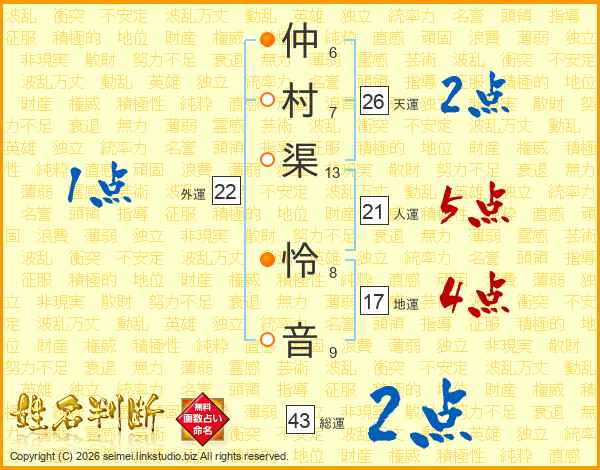 仲(6画)村(7画)渠(13画) 怜(8画)音(9画)