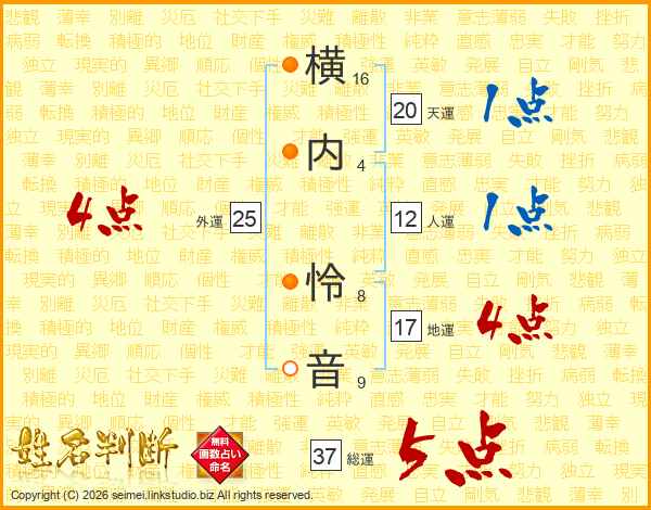 横(16画)内(4画) 怜(8画)音(9画)