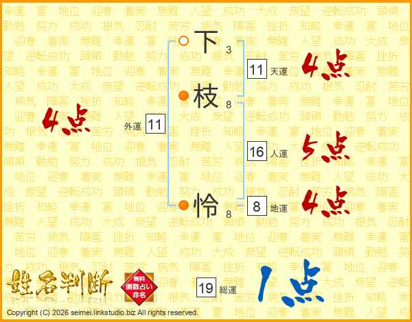 生活面を象徴する運勢です。外部から受ける影響力を表し、結婚運、家庭運や職場、環境への順応性を表します。総運から人運を引いた画数。姓や名が1文字の場合を除く。