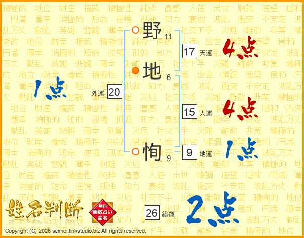 生活面を象徴する運勢です。外部から受ける影響力を表し、結婚運、家庭運や職場、環境への順応性を表します。総運から人運を引いた画数。姓や名が1文字の場合を除く。