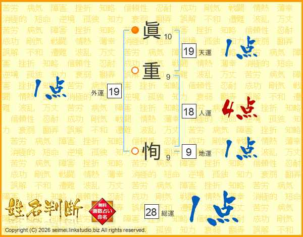 生活面を象徴する運勢です。外部から受ける影響力を表し、結婚運、家庭運や職場、環境への順応性を表します。総運から人運を引いた画数。姓や名が1文字の場合を除く。
