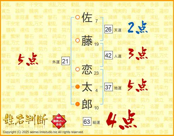 佐(7画)藤(19画) 恋(23画)太(4画)郎(10画)