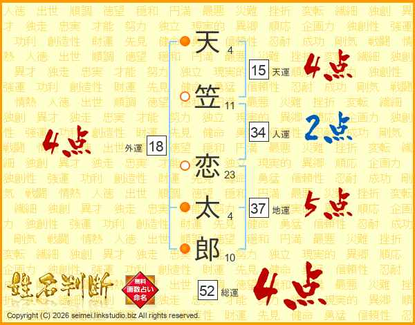 天笠恋太郎さんの総運は52画の4点!