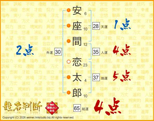 安(6画)座(10画)間(12画) 恋(23画)太(4画)郎(10画)