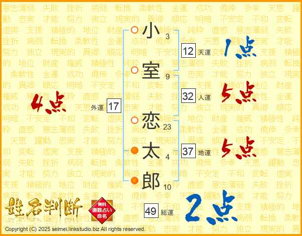 小(3画)室(9画) 恋(23画)太(4画)郎(10画)