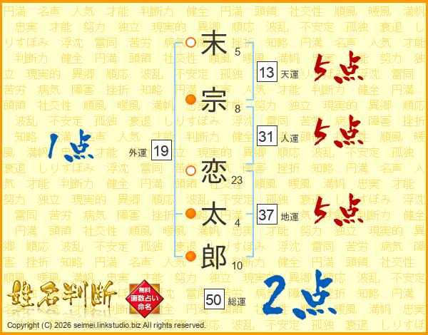 末(5画)宗(8画) 恋(23画)太(4画)郎(10画)