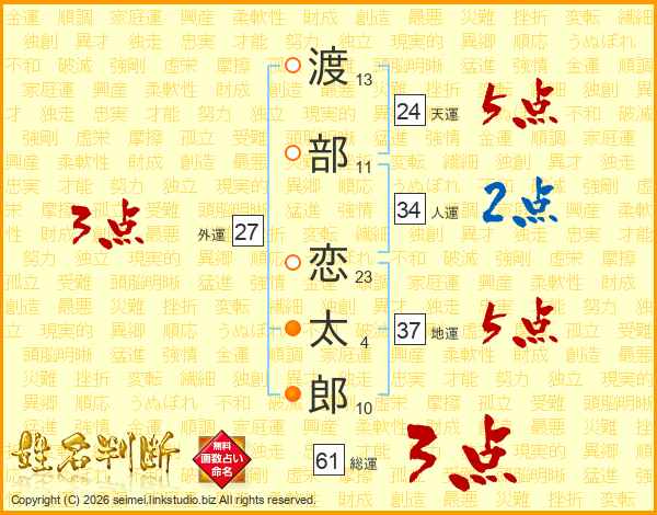 渡(13画)部(11画) 恋(23画)太(4画)郎(10画)