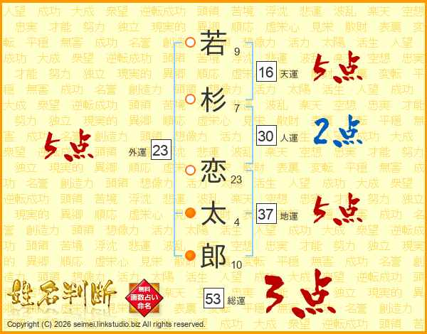 若(9画)杉(7画) 恋(23画)太(4画)郎(10画)