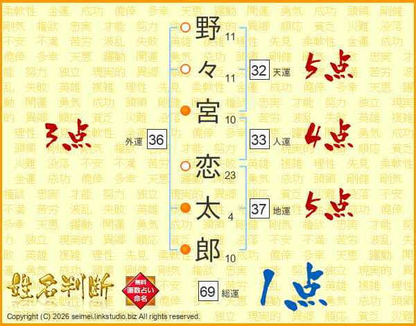 野(11画)々(11画)宮(10画) 恋(23画)太(4画)郎(10画)