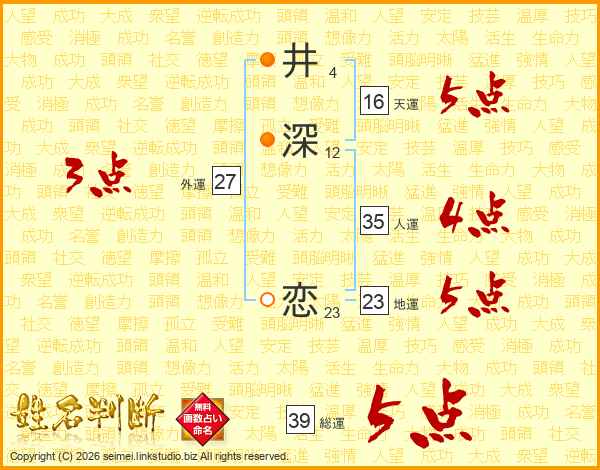 あなたの人生を表す1番重要な運勢です。生涯を通じて影響する総合運となり、主に50歳以降の晩年期に影響を及ぼします。苗字と名前の合計画数。