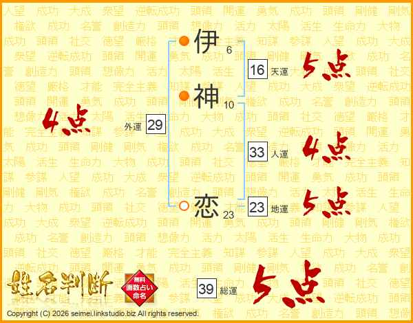 伊(6画)神(10画) 恋(23画)