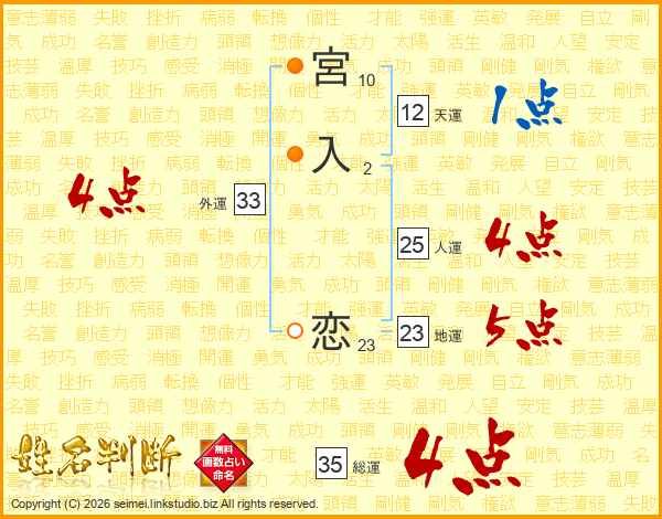 生活面を象徴する運勢です。外部から受ける影響力を表し、結婚運、家庭運や職場、環境への順応性を表します。総運から人運を引いた画数。姓や名が1文字の場合を除く。