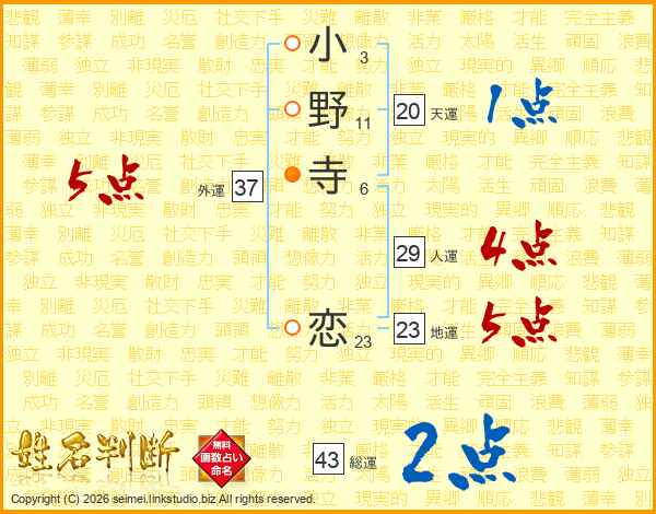 小野寺恋さんの総運は43画の2点!