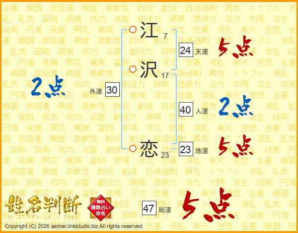 生活面を象徴する運勢です。外部から受ける影響力を表し、結婚運、家庭運や職場、環境への順応性を表します。総運から人運を引いた画数。姓や名が1文字の場合を除く。