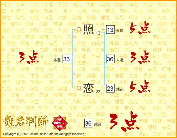 生活面を象徴する運勢です。外部から受ける影響力を表し、結婚運、家庭運や職場、環境への順応性を表します。総運から人運を引いた画数。姓や名が1文字の場合を除く。