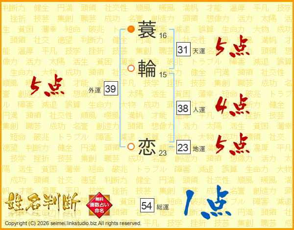 生活面を象徴する運勢です。外部から受ける影響力を表し、結婚運、家庭運や職場、環境への順応性を表します。総運から人運を引いた画数。姓や名が1文字の場合を除く。