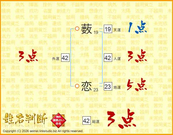 生活面を象徴する運勢です。外部から受ける影響力を表し、結婚運、家庭運や職場、環境への順応性を表します。総運から人運を引いた画数。姓や名が1文字の場合を除く。