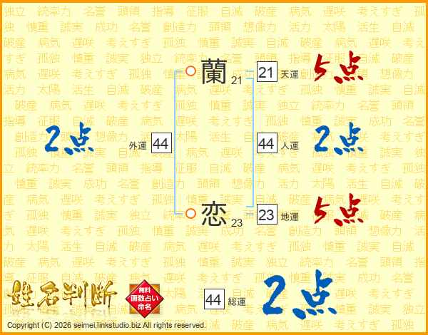 生活面を象徴する運勢です。外部から受ける影響力を表し、結婚運、家庭運や職場、環境への順応性を表します。総運から人運を引いた画数。姓や名が1文字の場合を除く。