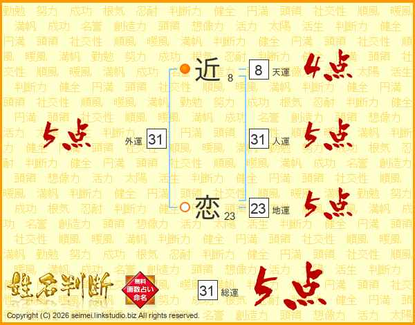 生活面を象徴する運勢です。外部から受ける影響力を表し、結婚運、家庭運や職場、環境への順応性を表します。総運から人運を引いた画数。姓や名が1文字の場合を除く。