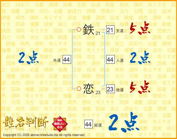 生活面を象徴する運勢です。外部から受ける影響力を表し、結婚運、家庭運や職場、環境への順応性を表します。総運から人運を引いた画数。姓や名が1文字の場合を除く。