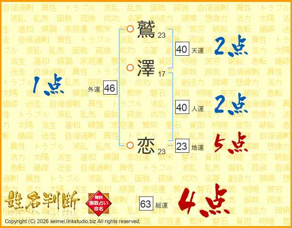 鷲澤恋さんの総運は63画の4点!
