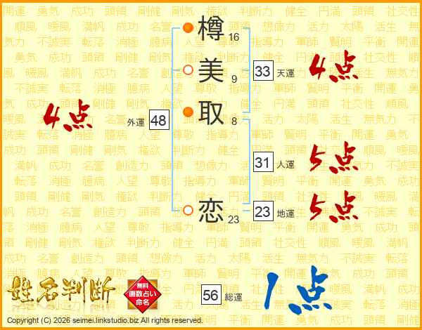 あなたの人生を表す1番重要な運勢です。生涯を通じて影響する総合運となり、主に50歳以降の晩年期に影響を及ぼします。苗字と名前の合計画数。