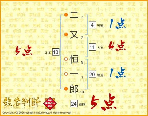 生活面を象徴する運勢です。外部から受ける影響力を表し、結婚運、家庭運や職場、環境への順応性を表します。総運から人運を引いた画数。姓や名が1文字の場合を除く。