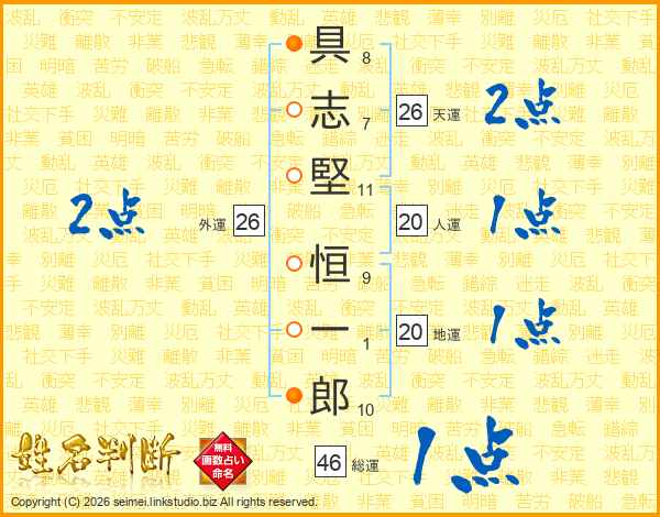 具(8画)志(7画)堅(11画) 恒(9画)一(1画)郎(10画)
