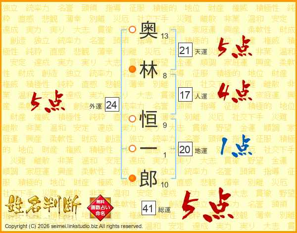 奥林恒一郎さんの総運は41画の5点!