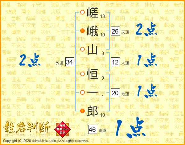 嵯(13画)峨(10画)山(3画) 恒(9画)一(1画)郎(10画)