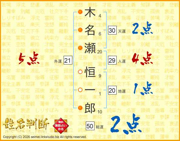 木(4画)名(6画)瀬(20画) 恒(9画)一(1画)郎(10画)
