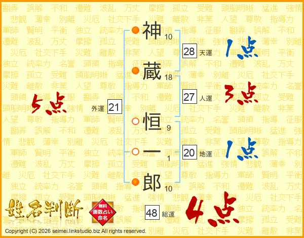 神(10画)蔵(18画) 恒(9画)一(1画)郎(10画)