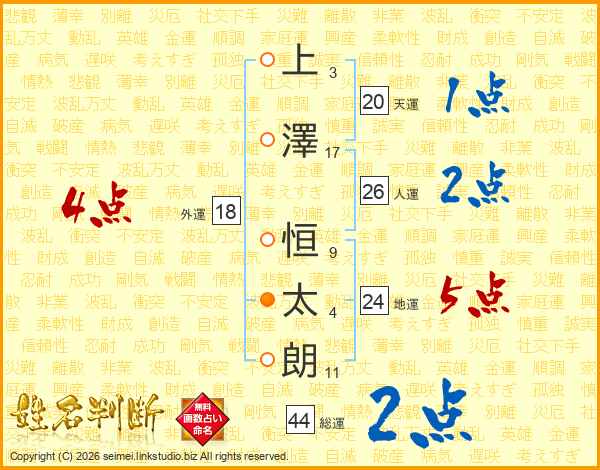 上(3画)澤(17画) 恒(9画)太(4画)朗(11画)