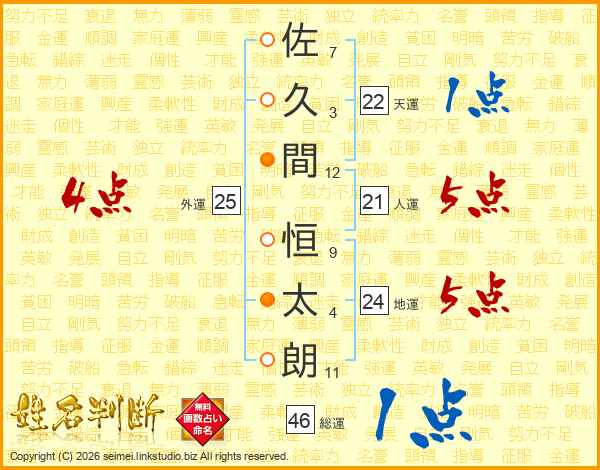 佐(7画)久(3画)間(12画) 恒(9画)太(4画)朗(11画)