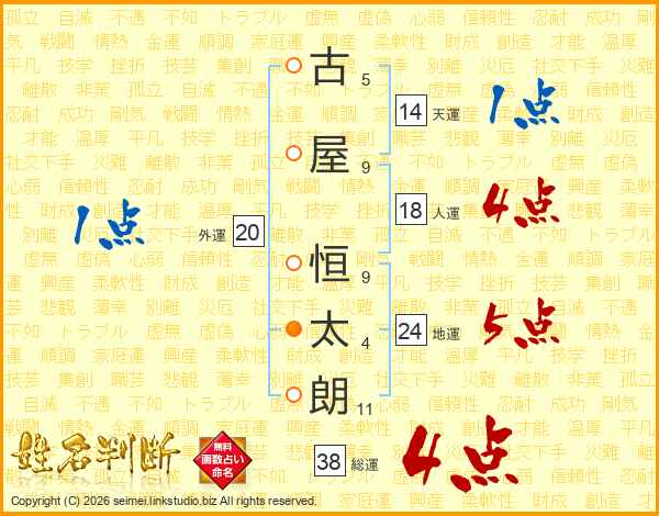 古(5画)屋(9画) 恒(9画)太(4画)朗(11画)