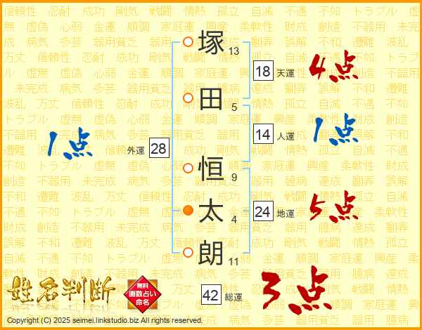 塚(13画)田(5画) 恒(9画)太(4画)朗(11画)