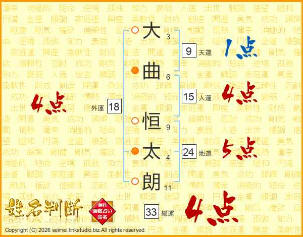 大(3画)曲(6画) 恒(9画)太(4画)朗(11画)