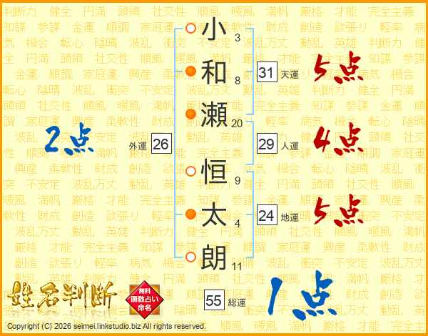 小(3画)和(8画)瀬(20画) 恒(9画)太(4画)朗(11画)