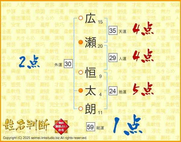 広(15画)瀬(20画) 恒(9画)太(4画)朗(11画)