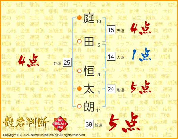 庭(10画)田(5画) 恒(9画)太(4画)朗(11画)