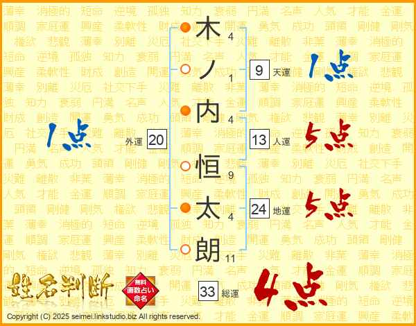 木(4画)ノ(1画)内(4画) 恒(9画)太(4画)朗(11画)