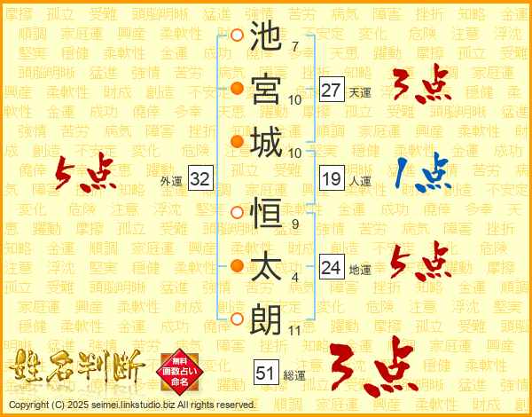 池(7画)宮(10画)城(10画) 恒(9画)太(4画)朗(11画)