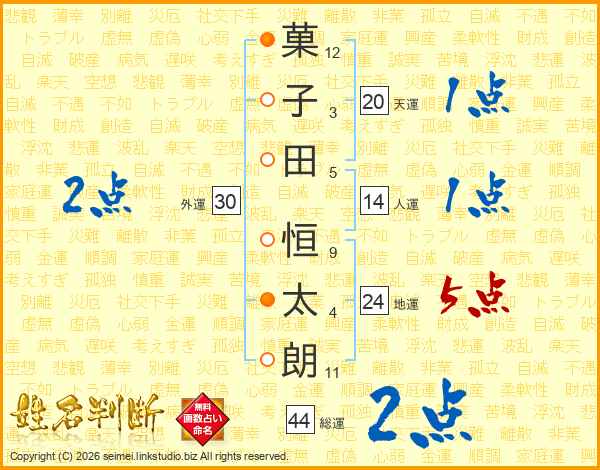 菓(12画)子(3画)田(5画) 恒(9画)太(4画)朗(11画)