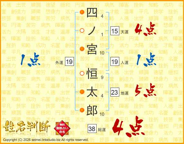 四ノ宮恒太郎さんの総運は38画の4点!