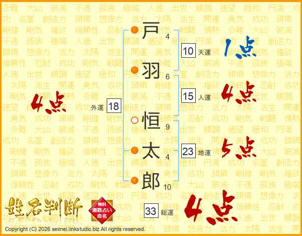 戸(4画)羽(6画) 恒(9画)太(4画)郎(10画)