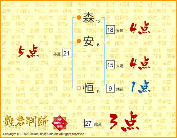 あなたの人生を表す1番重要な運勢です。生涯を通じて影響する総合運となり、主に50歳以降の晩年期に影響を及ぼします。苗字と名前の合計画数。
