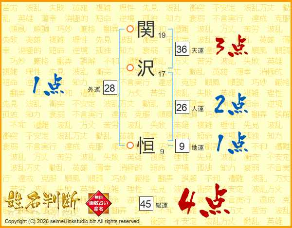 関(19画)沢(17画) 恒(9画)